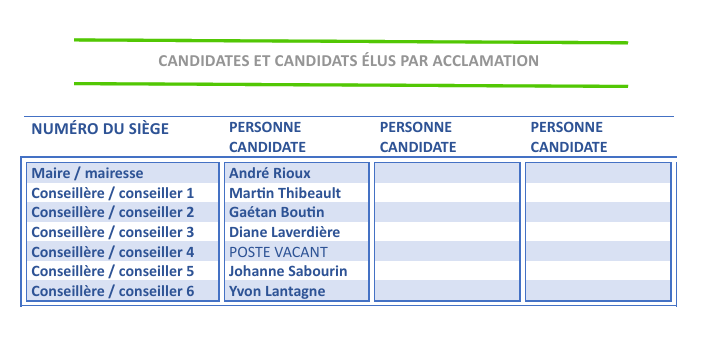 La période des dépôts de candidatures pour le siège numéro 4 se tiendra du 10 octobre 2025 au 24 octobre 2025 inclusivement tout en tenant compte de l'horaire habituel du bureau. *Prenez note que le vendredi 24 octobre 2025 (dernière journée pour déposer une candidature) le bureau sera exceptionnellement ouvert